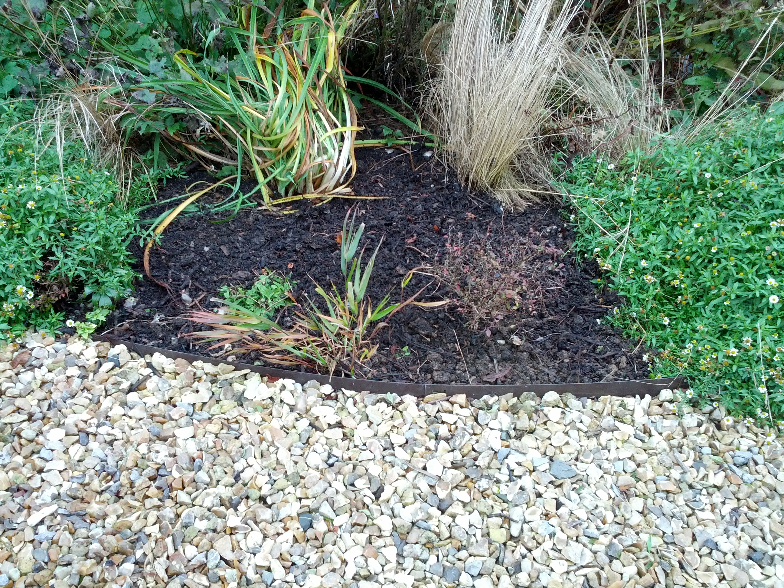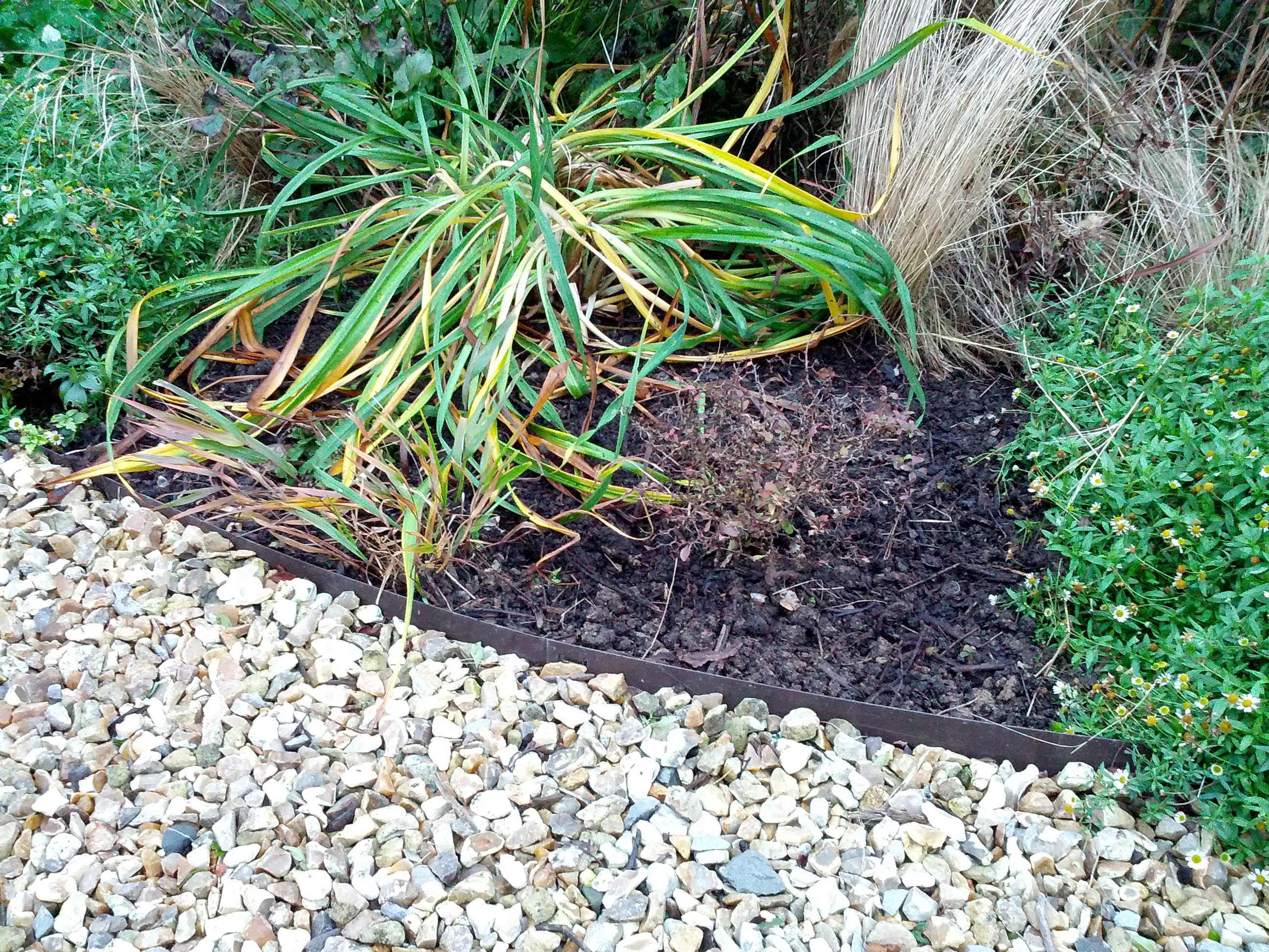 33 narcissus ‘Tresamble’ planted here. The day lily leaves will be gone by spring