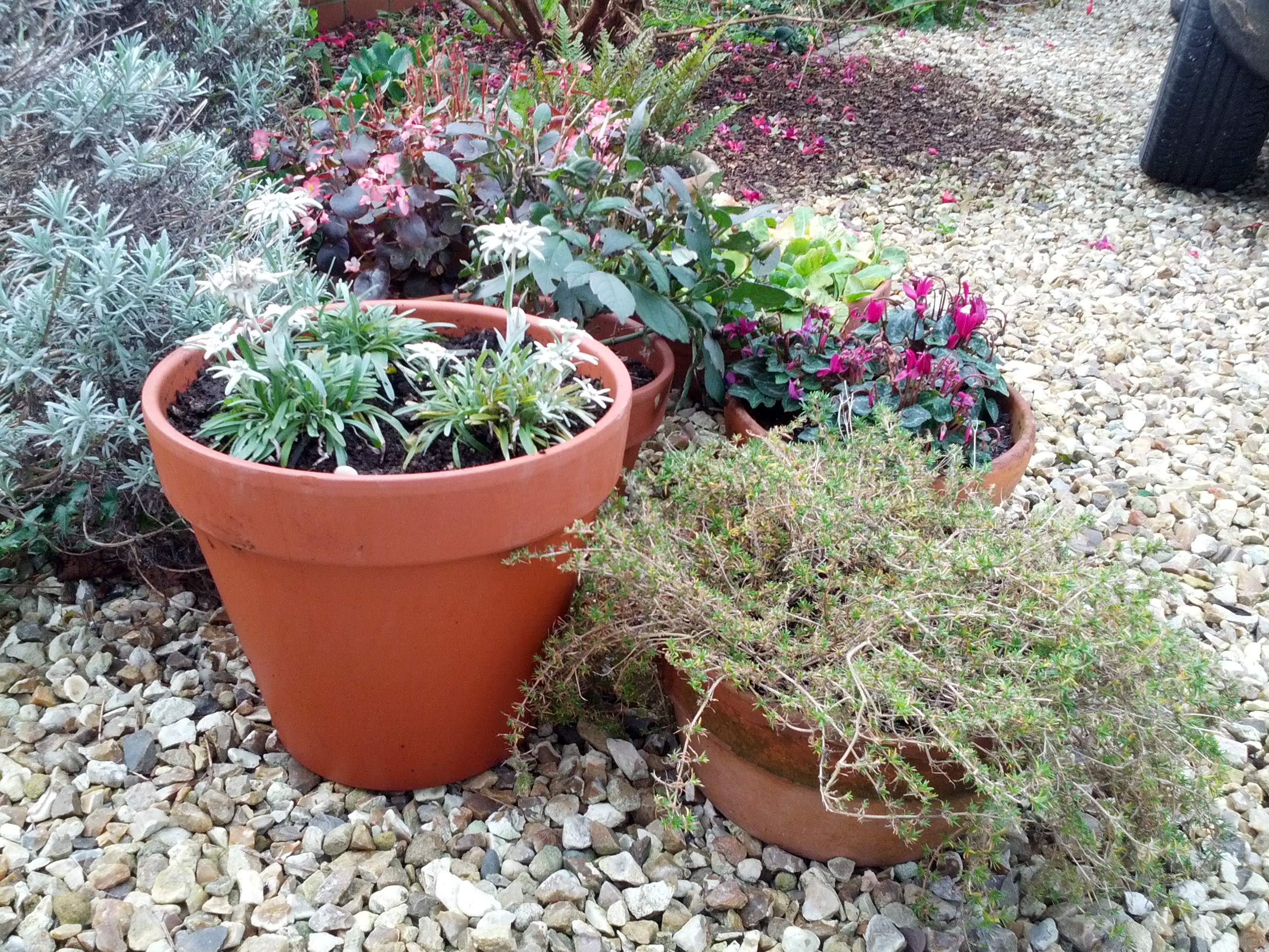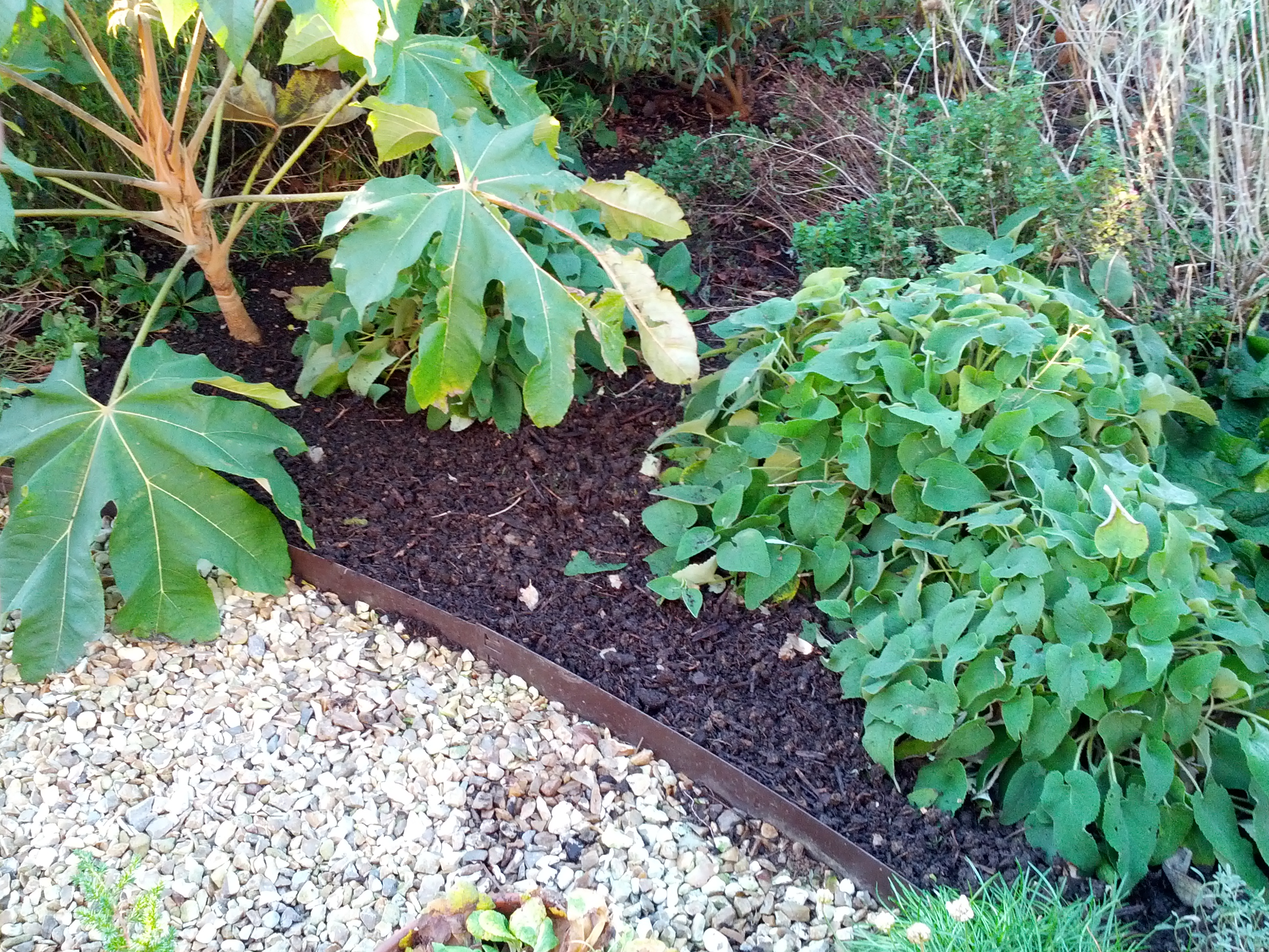 Moved the thyme which was rather shaded by the tetrapanax to a pot (with tulip bulbs underneath) and planted 20 narcissus ‘Carlton’ in the space left. I can’t remember exactly how the tetrapanax behaved last winter, but surely it’ll lose its leaves for the narcissi to flourish next spring.
