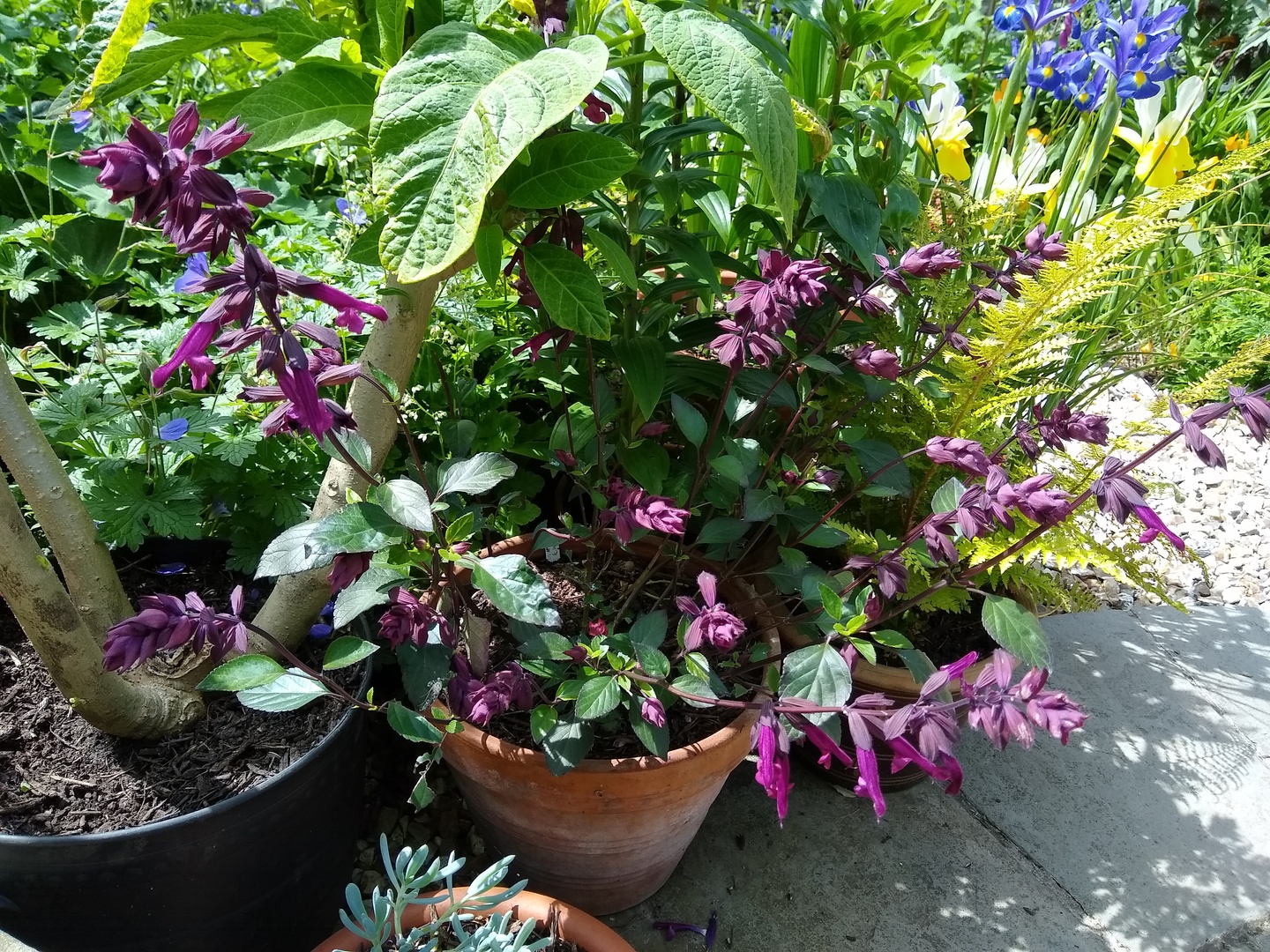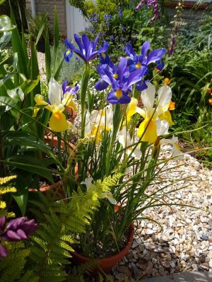 The irises are very good, and can be moved out of the way when they’re over. How good will they be next year if I leave them in their pots?