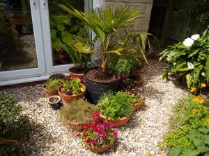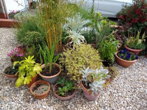 The abelia doing well in a pot at the front could go in the middle of the patch of persicaria, although the RHS says it needs a ‘sheltered, sunny position’.