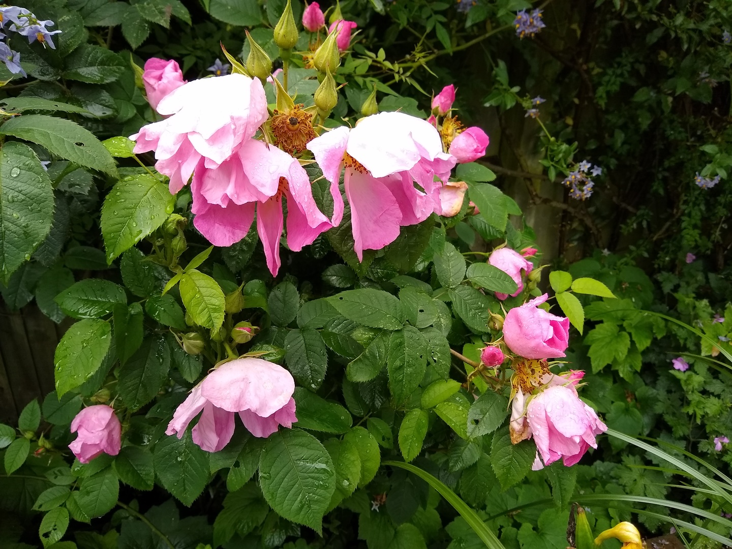 The Rosa complicata is just starting to flower. I need to prune it better next time.