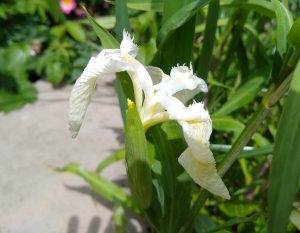 The white flag iris, Iris pseudacorus ‘Crême de la crême’ was obviously better last week, when I was away, but it’s still lovely today.