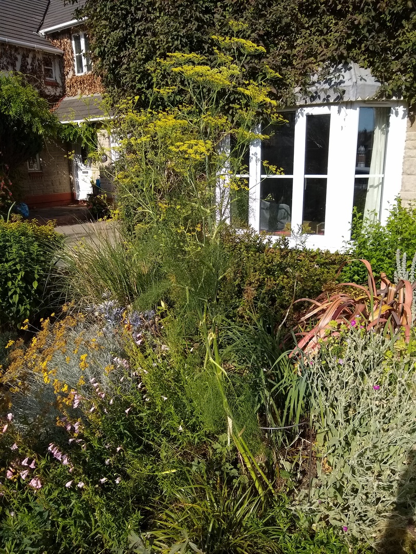 The Leucanthemum vulgare next to the path in F1 has stayed propped up, but is really rather too tall for this position. Perhaps a Chelsea Chop next spring will keep it under control. ‘Shapcott Gossamer’ has been allowed to flop, and is very effective.