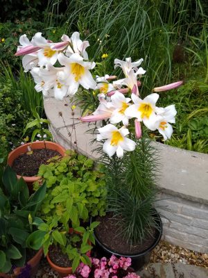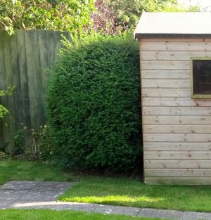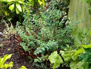 I took off about 50% of the foliage which must reduce its wind resistance. From most angles it looks much better, although the stems definitely seem to be divided into two parts – old and new. It’s just as tall as it was, which is the main thing.